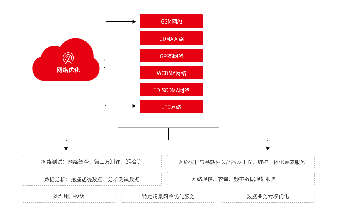 公司具有專業(yè)的網(wǎng)絡優(yōu)化分析團隊,具備多廠家、多運營商的綜合性網(wǎng)絡優(yōu)化能力,針對GSM、CDMA、TD-SCOMA、WCDMA、LTE等多種制式的無線網(wǎng)絡,提供整體的優(yōu)化解決方案,包括建網(wǎng)初期相后期擴容工程的工程網(wǎng)絡優(yōu)化服務、運維期間的日常網(wǎng)絡優(yōu)化服務、階段性分析解決網(wǎng)絡瓶頸的專項網(wǎng)絡優(yōu)化服務,通過測試數(shù)據(jù)分析、話統(tǒng)數(shù)據(jù)分析,結(jié)合天饋線系統(tǒng)優(yōu)化、無線參數(shù)優(yōu)化話務均衡等方式,對網(wǎng)絡性能指標進行優(yōu)化提升,最終達到提高網(wǎng)絡質(zhì)量以滿足終端用戶需求及提升網(wǎng)絡設備利用率的效果。